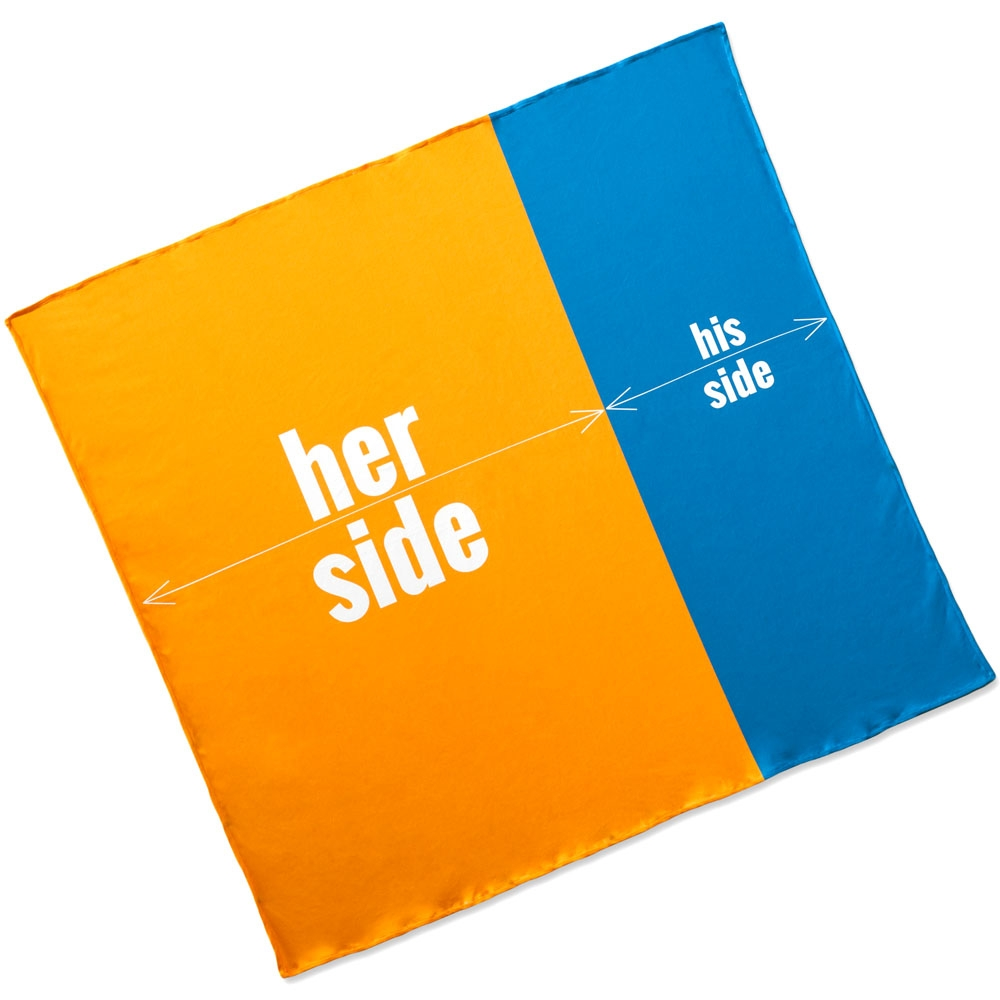 Ręcznik posiada dedykację, która humorystycznie ujmuje sedno sprawy: Ktokolwiek uważa, że małżeństwo to układ pół na pół, nie zna się albo na kobietach, albo na ułamkach...