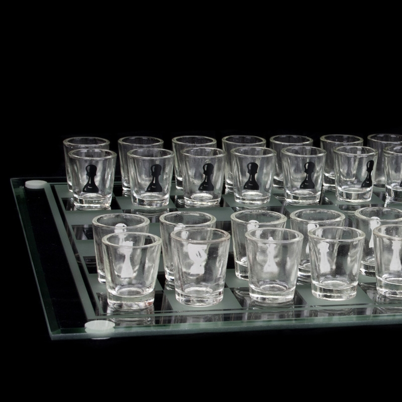 - w zestawie szklana plansza do gry i 32 kieliszki, a dodatkowo: pionki do gry w warcaby oraz talia kart